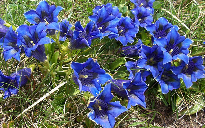 Der kurzstielige Enzian (Gentiana) gehört zur Familie der Enziangewächse (Gentianaceae). Es gibt ca. 300 bis 400 Arten. Einige Arten werden zur Schnapsherstellung genutzt. Eine Spezialität unserer Region ist der "Grassl Gebirgs-Enzian".