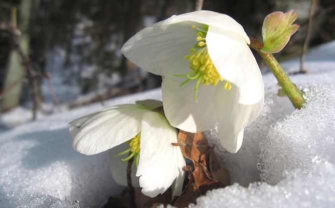 Die Schneerose, genannt auch Christrose (Helleborus niger) ist eine der ersten Frühlingsboten aus der Familie der Hahnenfußgewächse. Auffallend sind ihre großen, weißen Blüten.